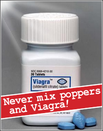 Perhaps the most important thing to know is that inhaling poppers will cause a short-lived but fairly sharp drop in your blood pressure. Consequently, you should never use poppers with any other substance that will do the same – especially not together with sildenafil, the active ingredient found in drugs for erectile dysfunction.